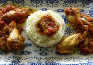 Limpiar las alitas de posibles plumas y dividirlas en sus partes la blanqueta y el alón Reservar las puntas para realizar algún caldo. Salar las alitas y sofreírlas un poco en aceite y reservar. Pelar los tomates y picarlos en daditos. Lavar los pimientos despepitarlos y córtalos en juliana. Pelar la cebolla y dos ajos y picarlos, pocharlos en aceite donde se han frito las alitas, una vez realizado añadir los pimientos rehogando unos 5 minutos. Incorporar el tomate y cocinar otros 5 minutos, finalmente las alitas y finalizar su cocción unos 15 minutos aproximadamente. Pelar los ajo restantes y sofreírlos en un poco de aceite sin quemarlos, incorporar el arroz y rehogar. Añadir el agua y sal correspondiente y cocinar al dente, escurrir. Servir el arroz acompañado con las alitas y su salsa y disfrutar.