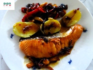 Servir el salmón acompañado de los pimientos y las patatitas partidas por la mitad, todo caliente.