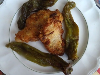 Lavar el perejil y picarlo fino, pelar 2 ajos y picarlos finos. Batir los huevos con un poco de sal, añadir el ajo y perejil y batir de nuevo. Salar un poco los filetes y meterlos en el huevo tapar y meter en la nevera unos 15 minutos aproximadamente. Lavar y secar bien los pimientos freírlos en aceite bien caliente, colocarlos sobre papel absorbente salarlos y reservar calientes. Sacar los filetes de la nevera y pasarlos por pan rallado, En una sartén grande calentar aceite y freír los filetes por ambos lados, ponerlo en una fuente sobre pape de cocina para que chupen el exceso de aceite. Servir todo caliente acompañado de los pimientos.
