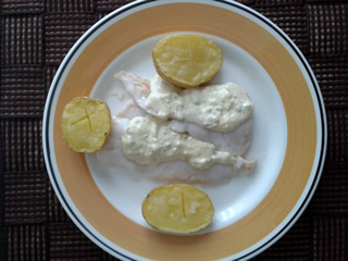 Retirar el pescado, sazonarlo y servirlo con la salsa y las patatas.