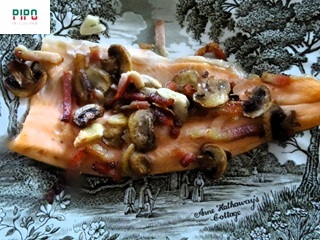 Colocar en una fuente los filetes de truchas cubrir con los champiñones y finalizar con los taquitos de jamón.