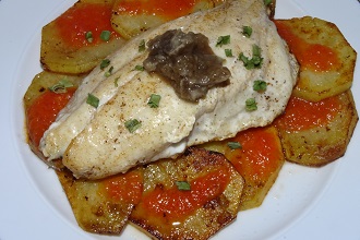 Servir haciendo una cama con las patatas y tomate, rematar con el filete del pescado.