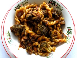 Limpiar los champiñones y picarlos en juliana. Lavar el brócoli y separar las florecitas en racimos pequeños Pelar los ajos y picarlo fino, sofreír en aceite los ajos y una vez bien pochado añadir el tomate y rehogar 10 minutos, Incorporar los champiñones y el brócoli cocinar hasta que estén al dente. Cocer la pasta en abundante agua con sal, dejarla al dente y escurrirla. Saltearla con la salsa y servir el queso aparte para que cada uno se sirva.