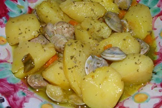 Incorporar las chirlas lavadas y dejar que se abran, poner las patatas y mezclar.