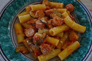 Lavar y cortar las puntas y partir a lo largo el calabacín. Seguidamente cada parte por la mitad a lo largo y picar en juliana mediana. Pelar la cebolla y los ajos y picarlos. En una cazuela poner aceite y sin calentar añadir la cebolla y los ajos. Incorporar el calabacín y rehogar unos minutos. Calentar aceite en la cazuela y pochar a fuego lento la cebolla y los ajos. Incorporar el tomate y, salar. Dejar que empiece a hervir y bajar el fuego, cocinar 15 minutos y añadir las salchichas cortadas en trozos. Cocinar el tiempo indicado o hasta que haya espesado. Cocer la pasta al dente en abundante agua con sal y escurrirla. Mezclar la pasta con la salsa y añadir el queso.