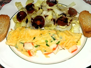 Cortar las baritas de surimi en rodajas, reservar. Limpiar los ajetes y picarlos en trozos pequeños, pocharlos en un poco de aceite y reservarlos Batir los huevos que utilicemos para cada tortilla con un poco de sal, añadir surimi a voluntad. Calentar un poco de aceite y cuajar las tortillas de una en una. Limpiar y las endivias cortarlas en juliana gruesa, lavar los tomates y partirlos por la mitad. Aliñar al gusto con aceite, vinagre y sal. Servir la tortilla acompañada de ensalada y disfrutar de la misma.