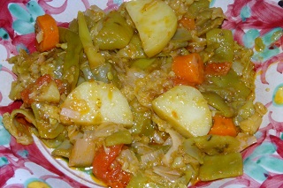 Pelar las patatas, la zanahoria y trocearlas. Lavar quitar las hebras a las judías y cortarlas en trozos. Lavar el repollo y cortarlo en juliana, pelar la cebolla. Poner todas las verduras en la cazuela, cubrir de agua y salar. Cocer aproximadamente el tiempo indicado, escurrir. Lavar los tomatitos y partirlos por la mitad, pelar los ajos y picarlos. Calentar aceite y sofreír los ajos y cuando empiezan a dorarse añadir los tomatitos. Cocinar unos minutos dejando que se hagan y en ese momento incorporar el resto de las verduras. Rehogar todo bien comprobando la sal y servir caliente.